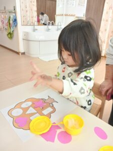 3種類の表情を英語で答えたり、色々な形を紙にのりで貼ったりして楽しみました🥰