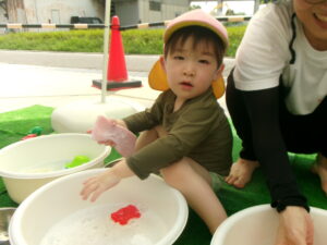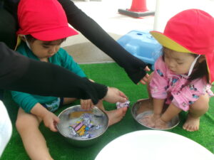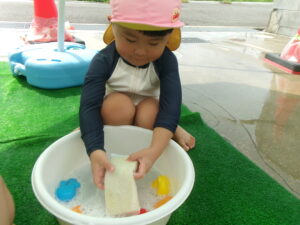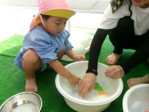 氷🧊の冷たさや色水の変化や金魚すくいの楽しさや泡あそびもしましたね🥰