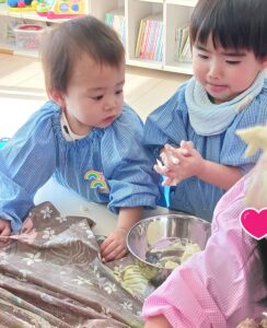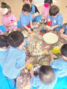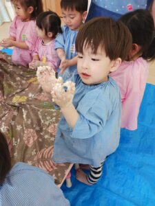 今日はみんなで一緒に小麦粉に水を混ぜて、感触を楽しんだり